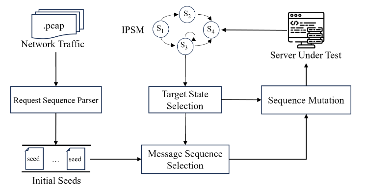 Pham و همکاران. [20] اولین ابزار فازینگ پروتکل graybox stateful، AFLNet، را بر اساس AFL [21] توسعه دادند. پس از این، فازینگ پروتکل graybox به سرعت پیشرفت کرده است. به عنوان مثال، SGPFuzzer [22] با اصلاح استراتژیهای جهش توالی پیام، اثربخشی موارد آزمایشی تولید شده را بهبود میبخشد، در حالی که SnapFuzz [23] از فناوری snapshot برای افزایش سرعت تولید موارد آزمایشی و توان عملیاتی سیستم استفاده میکند.