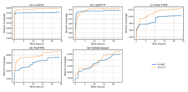 مبنای مقایسه. ما مقایسهای بین SCFuzz و ابزار فازینگ جعبه خاکستری متنباز پایهای برای پروتکلهای شبکه، AFLNet، انجام دادیم. AFLNet به طور خاص برای فازینگ پروتکلهای شبکهی حالتمند طراحی شده است. این ابزار با معرفی یک استراتژی بازخورد آگاه از وضعیت، AFL پرکاربرد را گسترش میدهد. این ابزار، انتقال وضعیتهای خاص پروتکل را در طول فازینگ نظارت میکند و پوشش بهتری را در سرویسهای شبکهی حالتمند فراهم میکند. سایر فازرهای پرکاربرد، مانند StateAFL [3] و NSFuzz [4]، نیز بر اساس AFLNet ساخته شدهاند، اما روش زمانبندی اولیهی خود را اصلاح نکردهاند. بهبودهای ایجاد شده توسط این ابزارها، متعامد با بهبودهای معرفی شده توسط SCFuzz است. با مقایسهی آزمایشهای خود با AFLNet، میتوانیم اثربخشی روش زمانبندی اولیهی پیشنهادی در این مقاله را در رابطه با فازرهای موجود ارزیابی کنیم.