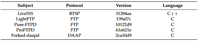 معیار سنجش. جدول 2 اطلاعات دقیقی در مورد پیادهسازیهای پروتکل شبکه مورد استفاده در ارزیابی ما ارائه میدهد. ما اهداف فازینگ را از معیار فازینگ پروتکل شبکه، یعنی ProFuzzBench [6]، انتخاب میکنیم. ارزیابی ما شامل سه پروتکل شبکه مجزا است که توسط پنج پیادهسازی سرویس شبکه مختلف نشان داده میشوند، از جمله پروتکلهای پرکاربرد مانند FTP، RTSP و DAAP.