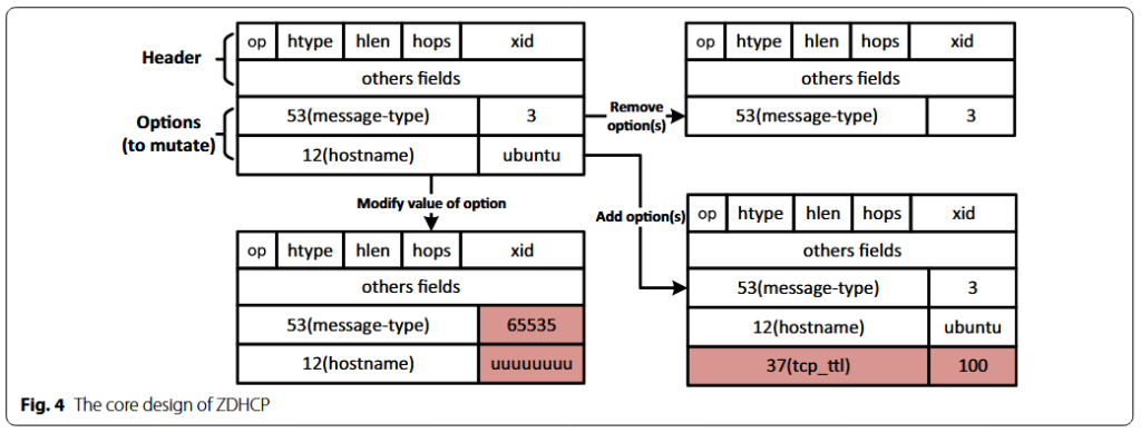 با استفاده از PGD هدف، NDFuzz میتواند اطلاعات زمان اجرا از یک فرآیند کاربر را به دست آورد و اطلاعات را به فازر بازگرداند. دو مکانیسم نظارتی، یعنی یک مکانیسم درون VMM مبتنی بر ردیابی و یک مکانیسم بیرون VMM مبتنی بر پرش پوششی، برای گرفتن هر چه بیشتر استثنائات ارائه شدهاند. به عنوان یک چارچوب، NDFuzz میتواند برای تقویت فازرهای جعبه سیاه استفاده شود. NDFuzz یک فازری را که توسط خودمان برای DHCP توسعه داده شده است، ادغام میکند. ما همچنین یک فازر پروتکل عمومی موجود Mutiny (https://github.com/Cisco-Talos/mutiny-fuzzer) را برای پشتیبانی از ضبط و راهنمایی پوشش بهبود میدهیم.