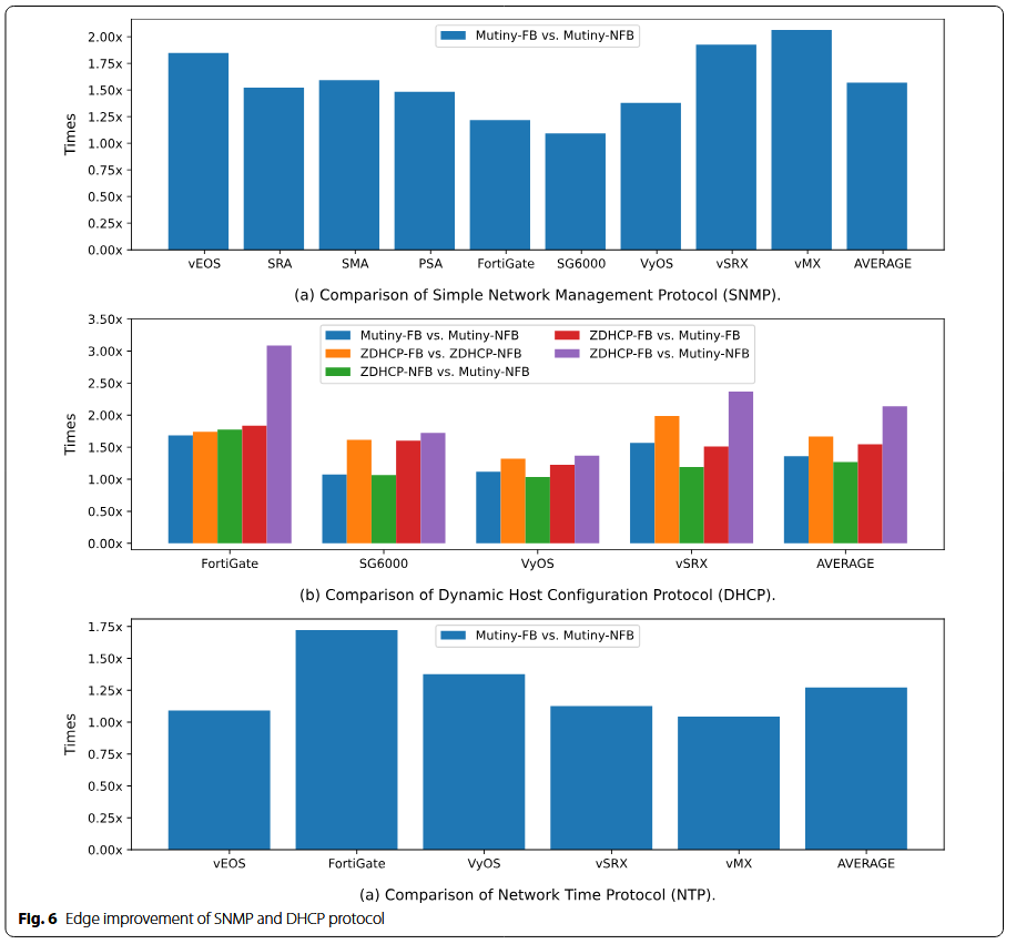 ما NDFuzz را بر پایه دو فازر جعبهسیاه (black-box) پیادهسازی کرده و آن را با استفاده از سه پروتکل شبکه شاخص شامل SNMP، DHCP و NTP، بر روی ۹ دستگاه محبوب شبکه مجازیسازی شده ارزیابی کردهایم. نتایج نشان میدهد که NDFuzz در مقایسه با نسخههای جعبهسیاه متناظر خود، بهطور میانگین ۳۶٪ بهبود در پوشش کد به دست میآورد.