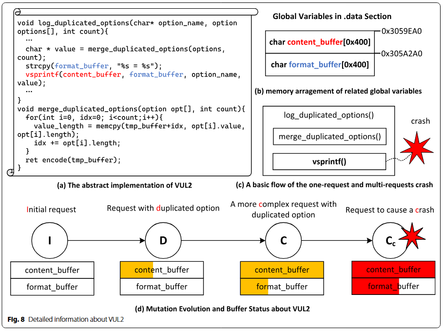 بهدلیل سازوکارهای حفاظت یکپارچگی در VNFها، فازینگ جعبهسیاه یکی از مستقیمترین روشها برای کشف آسیبپذیریها محسوب میشود و بهطور گسترده در فازینگ دستگاههای IoT استفاده شده است (Feng et al. 2021؛ Chen et al. 2018؛ Zhang et al. 2019). منطق اصلی فازینگ در ماژول ارسالکنندهٔ بسته پیادهسازی میشود که قادر است درخواستهای جهشیافته را به فرایند هدف ارسال کند (پیکان زرد در شکل ۱). در صورتی که ارتباط قطع شود یا پاسخ با محتوای خاصی دریافت گردد، ممکن است کرش رخ دهد و درخواست مربوطه ثبت میشود.