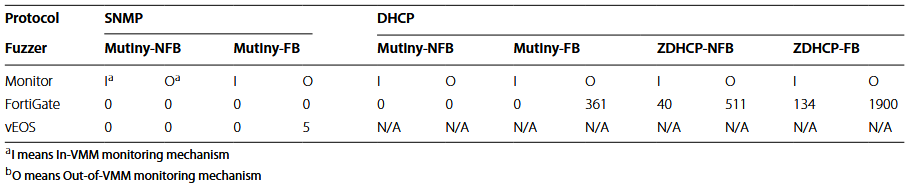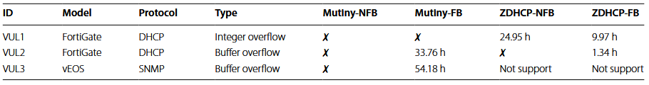- آسیبپذیریهای کشف شده در VNFهای مختلف NDFuzz برای فازی کردن سه پروتکل، SNMP، DHCP و NTP، در نه VNF محبوب تولید شده توسط هفت فروشنده استفاده میشود. در مجموع، سه آسیبپذیری توسط فروشندگان تأیید شده است، از جمله دو آسیبپذیری تازه کشف شده و یک آسیبپذیری ثابت شده.