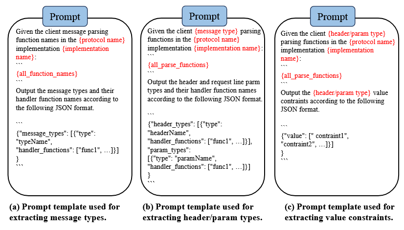 بر اساس ساختار نحو عمومی که در بخش ۳.۲.۱ معرفی شد، ما از مدل‌های زبانی بزرگ (LLMs) برای استخراج نحو پیام‌ها از فایل‌های کد منبع پیش‌پردازش‌شده استفاده کردیم، با تمرکز بر خط درخواست (Request Line) و فیلدهای هدر درخواست (Request Header Fields) در ساختار نحو عمومی.