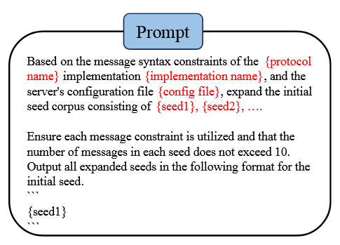 گسترش بذر (Seed Expansion). با توجه به نقش حیاتی تنوع و کیفیت بذر اولیه در فازینگ، ما بر افزایش این جنبه‌ها تمرکز کردیم. ما از درخت نحو پیام ساخته شده و فایل‌های پیکربندی پیاده‌سازی پروتکل برای هدایت LLMها استفاده کردیم. این رویکرد به گسترش مجموعه اولیه بذر کمک کرد و در نتیجه تنوع و کیفیت بذر را افزایش داد.