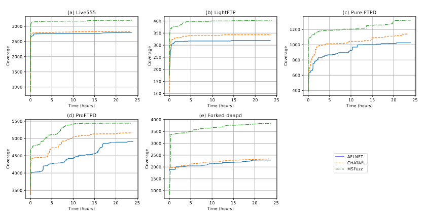 برای تأیید بیشتر اثربخشی MSFuzz، ما میانگین تعداد شاخه‌های کد کاوش‌ شده توسط فازرهای مختلف را طی پنج اجرای ۲۴ ساعته تحلیل کرده و نتایج را در شکل ۷ ارائه دادیم. همان‌طور که در شکل مشاهده می‌شود، MSFuzz  نه تنها بالاترین پوشش کد را در مقایسه با سایر فازرها به دست آورد، بلکه بالاترین سرعت کاوش را نیز نشان داد. شایان ذکر است که بهبودها در پیاده‌سازی‌های Pure-FTPD و Forked-daapd بیشترین مقدار را داشتند.