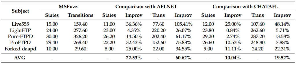 به‌منظور ارزیابی عملکرد MSFuzz، آن را با فازرهای پیشرفته‌ی روز ( SOTA یا State-of-the-Art) در حوزه فازینگ پروتکل، یعنی AFLNET و CHATAFL، مقایسه کردیم. نتایج تجربی نشان داد که MSFuzz در مقایسه با AFLNET و CHATAFL به‌طور متوسط به‌ترتیب به: