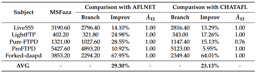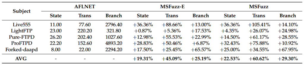 • MSFuzz در مقایسه با AFLNET، به‌طور متوسط ۲۹.۳۰٪ بهبود در پوشش شاخه‌های کد نشان داد.