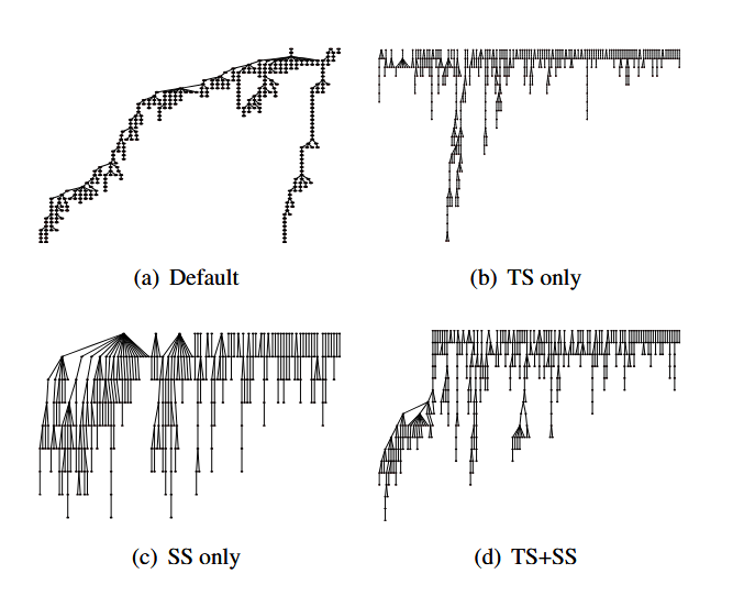 - فقط انتخاب بذر (شکل ۱۱ (c))، تعداد مناسبی درخت ایجاد میشود (۲۰۲ قبل از نمونهگیری) و درختها متعادلتر هستند. با این حال، واضح است که درخت ایجادشده توسط اولین تولید بسیار بیشتر از درختهای بعدی کاوش شده است.